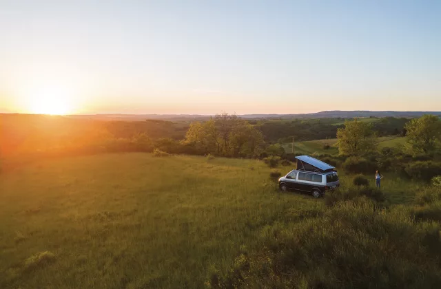 Avec Bivouacs Huttopia, Huttopia propose une sélection de terrains privés et publics accessibles aux vans aménagés de moins de 6 mètres, rigoureusement visités et validés. Chaque site accueille deux véhicules au maximum, pour deux nuits consécutives au plus. Une façon de garantir à la fois le calme des voyageurs et la préservation des lieux, tout en respectant les réglementations locales.