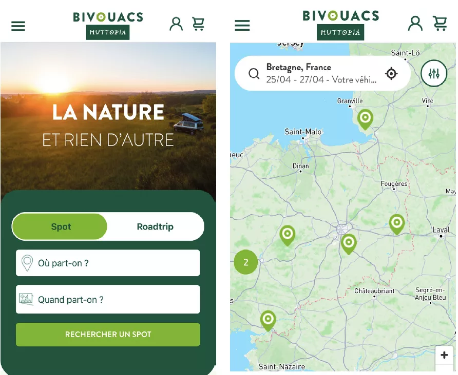 La réservation se fait via une web app intuitive, accessible directement depuis un smartphone. L’utilisateur peut composer son itinéraire en combinant bivouacs nature et campings Huttopia, selon ses envies.