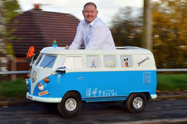 Après tout, il conduisait à moins de 10 km/h dans un combi vw pour enfant, pour récolter des fonds pour la recherche contre le cancer ! Rio Beardmore a conduit le véhicule construit à la main à une 800 m de sa maison au pub local après deux pintes de bière et six shots d’alcool.Mais les policiers n’ont pas goûté la plaisanterie, alors ils l’ont arrêté pour contrôler son alcoolémie. Résultat, près de trois fois la limite autorisée. Rio, un serrurier à son compte de la ville britannique de Stoke-on-Trent, a déclaré : « Je ne savais pas que je faisais quelque chose de mal ou contre toutes les règles en le conduisant. Quand la police m’a arrêté, je pensais qu’ils plaisantaient. Je ne pouvais pas croire ce qui se passait. « J’avoue avoir pris quelques verres avant de rentrer chez moi mais je n’ai vraiment pas pensé que ce serait un problème car la camionnette n’a pas de carte grise ou quelque chose comme ça. C’est une voiture-jouet en ce qui me concerne ». La fourgonnette bleue et blanche, qu’il a mis sept mois à construire, a été fabriquée à l’origine pour le fils de Rio, Daniel, 16 ans, qui est un amateur de combis VW. La fourgonnette a coûté environ 1500 € à construire et dispose d’un moteur électrique de scooter et d’une carrosserie en fibre de verre. Le père et le fils l’utilisent pour recueillir des fonds.Rio, qui a plaidé coupable au tribunal pour une accusation de conduire un véhicule à propulsion mécanique tout en étant inapte à conduire à cause de l’alcool, a déclaré: « J’ai recueilli environ £ 40 pour la recherche contre le cancer la nuit ou j’ai été arrêté.Les gens demandent à être pris en photo avec le van et font un don. » Il a été condamné à 12 mois de retrait de permis et une amende 800 €…