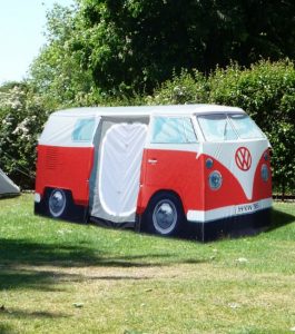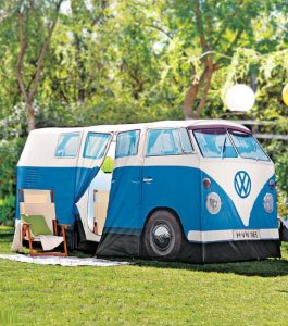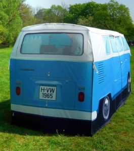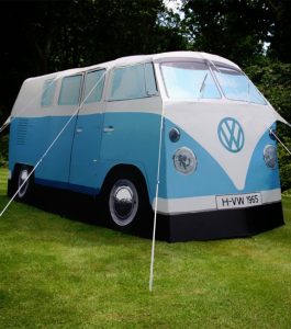 Pour accueillir des amis ou la famille, parfois le fourgon ne suffit plus. La solution est donc d’installer une tente le soir venu. Avec le modèle Camper Van VW, on reste dans l’esprit van. Et pour cause, il s’agit d’une copie identique du Combi T1 de 1965, en taille originale échelle 1. Fabriquée sous licence officielle Volkswagen, elle peut accueillir jusqu’à 4 adultes avec 2 chambres séparées (grâce à une fermeture éclair). L’entrée se fait par les portes latérales, comme sur le Combi d’époque.