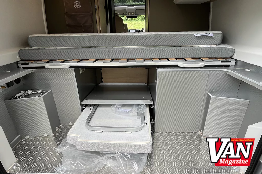 Le lit transversal adopte le système peigne, coulissant pour ajuster l’espace de soute selon les besoins. Résultat : plus de volume de rangement et un couchage plus confortable. Un sur-matelas optionnel parachève l’aménagement.