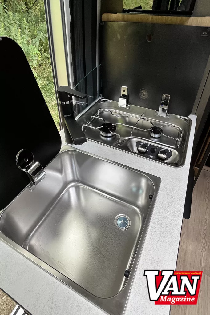 Le nouveau réchaud deux feux encastré, avec couvercle en verre noir, modernise l’espace. La surface de travail devient modulable grâce à une planche à découper intégrée et une tablette amovible utilisable dehors. Un tiroir à couverts accessible depuis l’extérieur complète l’ensemble. De quoi faciliter la vie à bord et en plein air.
