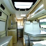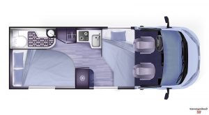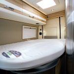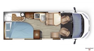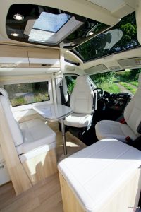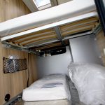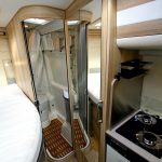 Le mélange des genres, c’est bien le but recherché par les designers de Campérêve, qui ont tout simplement souhaité intégrer dans un fourgon de 6,36m, une implantation très prisée sur le segment du camping-car profilé. Cette implantation se caractérise par un lit à la « française », une salle d’eau attenante et une cuisine en angle placée au centre de l’espace de vie. Concrètement, on trouve l’espace repas en face de la porte latérale. Espace qui pourra recevoir 5 convives, même si c’est bel et bien une carte grise 4 places qui accompagne ce Magellan 742.