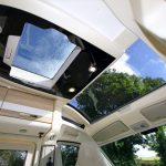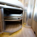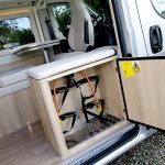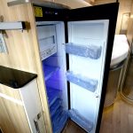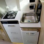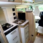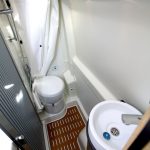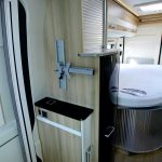 Cette 5ème place prend la forme d’un banc occupant une bonne moitié de l’espace de la porte coulissante. Mais ce banc est en fait un usage « détourné », car sa fonction première est d’accueillir les deux bouteilles de gaz de 13 kilos, chargées d’alimenter le système de chauffage / eau chaude Truma 4. Cet emplacement découle directement de l’implantation en partie arrière de la salle d’eau, qui réduit d’autant l’espace de la soute, lieu habituellement occupé par la ou les bouteilles de gaz. Un bel exemple d’optimisation de l’espace, avec au final un coin repas particulièrement accueillant. Cela d’autant plus qu’il est baigné de lumière, car dans cette finition Limited, seule version disponible du Magellan 742, la découpe de cabine et le toit en verre « Skyview » font partie de la dotation de série. C’est derrière la banquette double qu’est positionné le bloc cuisine, que l’on retrouve habituellement à proximité immédiate de la porte coulissante. Ce bloc cuisine se montre compact, mais il profite d’un décrochement pour intégrer un évier positionné en parallèle de la banquette, alors que le réchaud deux feux est lui dans le sens de la longueur. Autre particularité, malgré son format compact, ce meuble intègre pas moins de 6 tiroirs ! Dans le prolongement de ce bloc cuisine, un vaste meuble pleine hauteur avec penderie, fait la jonction avec la salle d’eau, qui occupe environ 1/3 de la largeur du fourgon. Salle d’eau à laquelle on accède par une porte coulissante à lamelles…