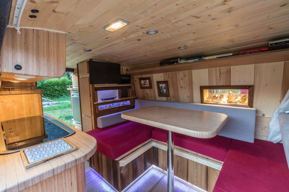 La cuisine est située sur le côté droit du fourgon, et facilite la circulation dans le véhicule, ainsi que le stockage de matériel volumineux pour les sportifs ou les familles (skis, snowboards, vélos, planches de surf). Campervans MontBlanc est aussi un entreprise pour qui l’éthique est primordiale ainsi tous leurs aménagements sont réalisés en Pin/ Sapin/ Mélèze et Épicéa qui proviennent de coupes sélectives qui font partie du programme de reconnaissance des certifications forestières ou PEFC (Pan European Forest Certification).