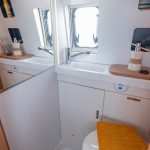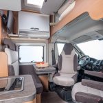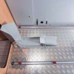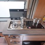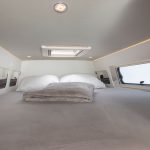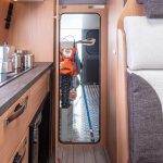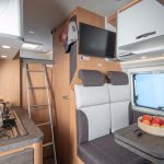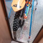 Ce garage se transforme également en vrai atelier avec la possibilité d’installer des servantes et un éclairage renforcé. L’aménagement, lui, est totalement isolé du garage et se compose d’un salon assez spacieux qui mélange différents tons de placages bois, une petite kitchenette (équipée toutefois de tout le nécessaire avec de gros tiroirs, un réchaud 2 feux, un évier et un frigo de 75 l). En face, la salle d’eau est contenue, mais fonctionnelle et surtout ultra lumineuse avec la grande baie. Au niveau de l’espace nuit, les lits (197,5 cm à droite, 193 cm à gauche) sont installés au-dessus du garage (le 630 MEG Outlaw est conçu sur le porteur Ducato rehaussé). Pour y accéder, une échelle a été posée devant la porte intérieure du garage.