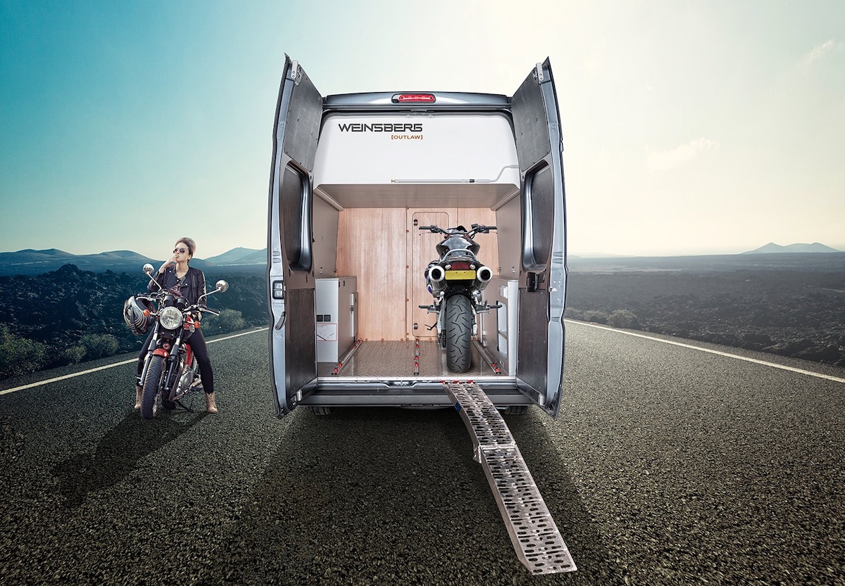 Grosse nouveauté du catalogue Weinsberg 2020, le CaraBus 630 MEG Outlaw. Ce dernier se destine aux baroudeurs qui ont besoin de loger dans leur fourgon des motos, des vélos ou un quad ! Ainsi, le constructeur allemand a réussi à installer dans le Fiat Ducato de 6.36 mètres un garage arrière étanche. Revêtu de tôle striée, il dispose d’attaches pour fixer les véhicules pendant le transport et de nombreux casiers pour loger les botes, les casques et divers accessoires. Les rampes d’accès sont livrées avec et ont le droit à leur emplacement spécifique.