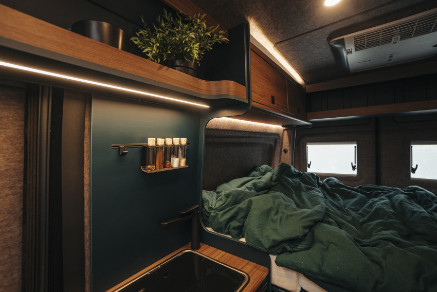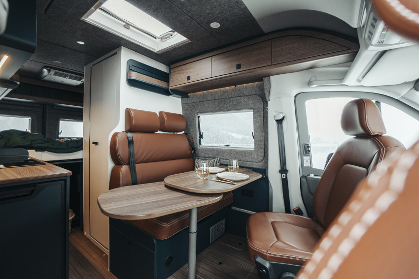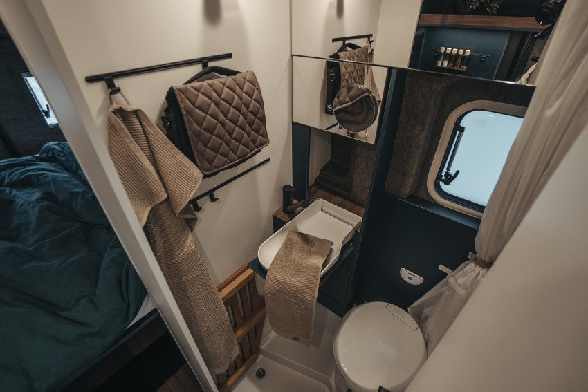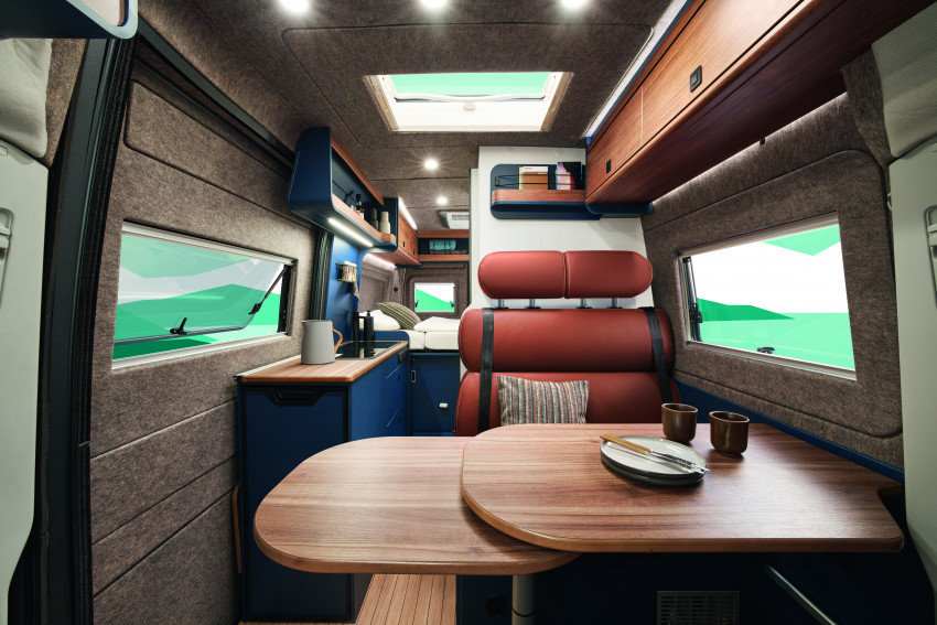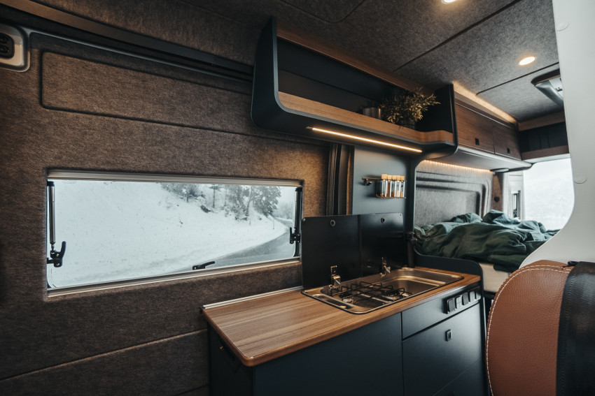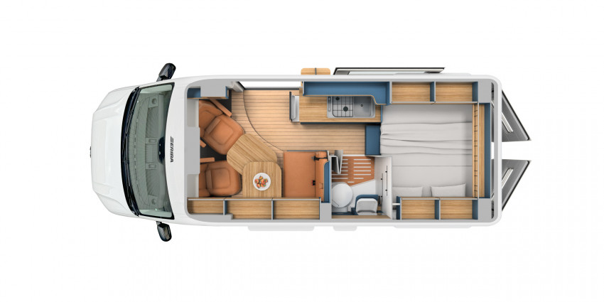 C’est la version 5,99 m du Volkswagen Crafter qui est retenue pour construire l’Eriba Car. Il sera disponible avec les motorisations 140 et 177 ch, la plus puissante étant associée à une boîte de vitesses automatique à 8 rapports. Les lignes du porteur son mises en valeur par une teinte bi-ton déclinée en trois variantes : Océan Intense, rouge Cerise ou gris Indium. À l’intérieur, un soin particulier a été porté sur la qualité de finition avec l’utilisation de matériaux modernes, un mobilier foncé et un plancher style nautique. Bon point également pour l’éclairage, direct et indirect, qui permet de faire varier l’intensité selon les envies. Pas moins de quatre selleries sont disponibles, deux en tissus et deux en cuir.