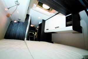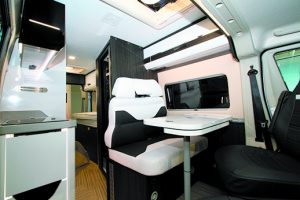 Si ce fourgon a une implantation similaire au 140 Up (avec lit transversal, 4 places carte grise, 3 places nuit, ambiance black & white, frigo 140 l), il a le droit à des équipements supérieurs. Un grand lanterneau a été ajouté, de même qu’une caméra de recul, un plan de travail en Corian (façon résine moulée), des stores d’occultation et une table de dinette qui se replie dans le sens de la longueur pour occuper un minimum de place. À 46 995 € pour un van aussi bien fourni, cela reste une excellente affaire. Toutefois, pour les plus exigeants, le Benivan 145 peut en plus avoir le droit à quelques options comme la carrosserie personnalisable (teinte gris foncé ou bleu, motorisation 150 ch, boite automatique).