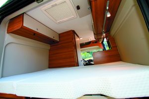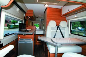 Les couples à la recherche d’un fourgon compact, bien équipé et particulièrement accessible, seront séduits par le V540 de Carado. Même s’il ne mesure que 5,41 mètres, il peut accueillir une 3ème personne à bord si vous choisissez l’option 3ème couchage. Si les volumes sont homogènes, les grands gabarits devront cependant se satisfaire d’une petite salle d’eau où les WC et le receveur de douche ne sont pas segmentés (comme c’est généralement le cas avec les fourgons de cette taille). L’espace demeure toutefois fonctionnel et parfaitement utilisable au quotidien. L’ambiance est clairement intemporelle avec un mélange de boiseries de surfaces blanches ou granit.