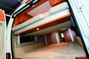 Avec 6,36 mètres, le Campscout Revolution mise sur les grands volumes. Destiné à la base pour 2 personnes, il peut cependant loger plus de monde grâce au lit superposé optionnel (642€) et au lit d’appoint dinette (322€). À l’avant, il dispose d’un beau salon et d’une cuisine plus contenue pour apporter un vaste espace de vie. À côté, le réfrigérateur de 138 litres marque un bon point et promet une autonomie d’une semaine (pour 2). Mais la priorité du Campscout Revolution, c’est d’offrir une grande salle de bains (les familles apprécieront). Pour cela, la douche a été disposée au centre et s’isole du reste du fourgon grâce à la paroi coulissante. Notez que cette dernière peut aussi servir à isoler la chambre où les 2 (ou 4) occupants dorment longitudinalement.