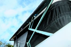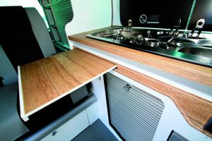 Si les modèles intégrés au catalogue de l’aménageur changent de nom (pour plus de simplification), la gamme Trek ajoute une disposition importante, le toit relevable maison sur les porteurs Fiat et Renault. Développé et conçu en interne et réalisé en polyester, il se compose de 2 faces gel-coat pour une meilleure résistance aux UV et à l’humidité, il intègre également une toile haute résistance. Ainsi pourvu, ce van peut donc accueillir 4 occupants pour la nuit (2 en bas, 2 dans le toit relevable). L’aménagement est toujours aussi complet (cuisine équipée, rangements…) et joue la carte du contraste avec les boiseries, les revêtements immaculés et les diverses touches d’aluminium.