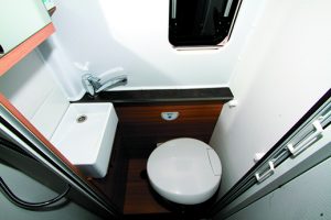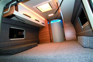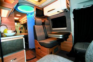 Chez Knaus, le Boxdrive ne laisse rien au hasard et pousse très loin le niveau du luxe. Élégant, polyvalent et spacieux, il réinvente tous les codes avec un mobilier qui adopte des formes spécifiques conçues spécialement pour l’occasion. La dînette est vaste et d’une qualité encore jamais atteinte. La table de grande dimension se montre parfaitement stable grâce à un pied latéral surdimensionné pour une disposition flottante. La kitchenette s’offre un plan particulièrement travaillé et bordé de Leds avec un réchaud à 2 feux et un évier. Dessous, les tiroirs avec système Push-to-Open et extension complète à bille permettent de s’organiser au mieux. À côté, les sanitaires paraissent plus classiques esthétiquement, mais la technologie est toujours au RDV avec le lavabo pliant, le miroir rabattable et la très grande douche centrale arrondie dans le couloir. Comme l’ensemble du van, elle a le droit à un éclairage d’ambiance agréable avec surfaces d’éclairage de différentes couleurs. Notons aussi dans l’espace de vie un plafonnier à intensité réglable, une penderie haute avec plancher intermédiaire réglable, un rangement spécifiquement dédié aux chaussures, des marches rétractables pour un accès au lit 197×95 / 212×83 plus aisé.
