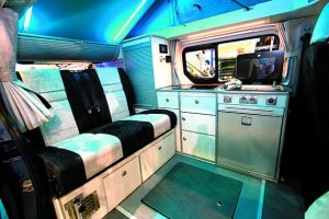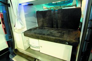 Avec l’Auto Loisirs 4, MCC propose un fourgon compact destiné aux longs séjours ! Rare sur le Trafic court. Ainsi, on retrouve à bord un bac à douche disposé entre la banquette et les places avant. L’autre prouesse, c’est d’avoir réussi à installer un frigo 65 l et une réserve d’eau propre hors gel de 60 l, un vrai record sur ce type de fourgon. Décliné en version GT, l’Auto Loisirs 4 adopte un grand toit relevable (option) pour loger un couchage à 2 places supplémentaires (1225 x 1960 cm/ aisance 1400 x 2000) et des équipements supplémentaires.