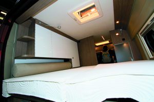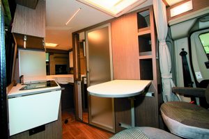 Vous trouvez que les aménagements tendent parfois à se ressembler ? Si vous ne voyagez qu’à deux et que vous cherchez un fourgon exclusif, le P2 Relax va vous séduire. Destiné à un couple (sans possibilité d’un 3e couchage optionnel), il a perdu sa banquette. À la place, on retrouve un grand placard qui vient même devant l’habituelle baie vitrée. La table vient alors se clipser, mais le salon semble généreux avec la disparition de la cloison habituelle entre la cabine et la cellule. À l’arrière, l’espace de couchage se résume en 2 lits jumeaux collés. À gauche, une succession de placards façon dressing. En clair, vous n’allez pas manquer de place !