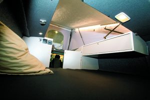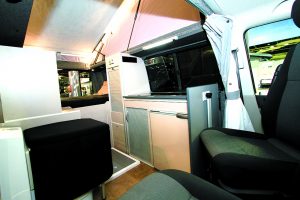 Chez Stylevan, la gamme 2019 a le droit à un grand bouleversement. Racheté en 2017 par le groupe Rapido, l’aménageur bourguignon dispose désormais de 2 familles distinctes. La première (« Origin ») est toujours produite à Auxerre avec une vente en direct. La seconde (« Emotion ») est cette fois construite chez Fleurette en Vendée et la distribution est assurée dans le réseau d’une trentaine de concessions. La série Equinox fait partie de la gamme « Origin » et se décline en 2 versions : Equinox II (2 places) et Equinox IV (4 places) sur le Transporter ou le Trafic. L’Equinox II, lui, n’a qu’un but, favoriser les grandes expéditions en duo, le tout avec un grand confort et de nombreuses fonctionnalités. À bord, le salon est spacieux et la cuisine attenante offre toutes les fonctionnalités. Au niveau du couchage, on a le droit à un vrai lit permanent (terminé les manipulations quotidiennes) et une réserve de 80 litres en eau propre (rare sur ce type de fourgon) associée à une douche intérieure au centre et à un WC fixe proche de la porte. Quant au toit relevable, il assure une parfaite circulation.