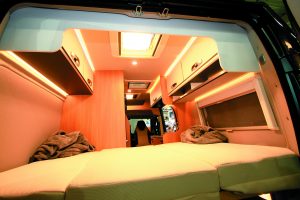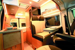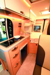 Avec la série CaraTour, Weinsberg parle de « concentration sur l’essentiel ». On se passe ainsi de superflu pour s’adresser aux baroudeurs. On totalise ici aussi 7 fourgons (de 2 à 5 couchages) pour cette seule famille: 1 en 5,41 m, 5 en 5,99 m et 1 en 6,36m. Le 540 MQ est le plus compact de la gamme. Destiné à 2 occupants (il peut toutefois accueillir une 3e personne sur le lit dinette), il est d’abord conçu pour ceux qui recherchent une solution compacte et polyvalente. Aucun souci pour stationner, le 540 MQ est à peine plus grand qu’une berline. Si la douche est assez contenue, elle offre l’essentiel et surtout elle permet de ne pas trop mordre sur le salon. Celui-ci est accueillant (surtout avec l’ambiance lumineuse à LED), dispose d’une table et d’une rallonge façon granit, d’un grand rangement au-dessus de la baie vitrée. Si, en face, la cuisine semble compacte, une fois qu’on lève la tablette escamotable, on se rend compte que l’espace suffisant pour cuisiner. Une fois encore, les LED apportent une ambiance cosy et font ressortir au mieux les boiseries et les surfaces blanches. À l’arrière, le lit transversal dispose d’une grande surface de couchage et comme il est disposé à mi-hauteur, la soute est généreuse. Un sans fautes.
