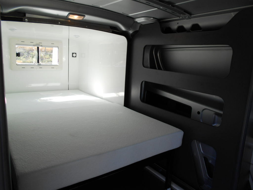 La marque française BeauEr, basée dans le Maine-et-Loire et spécialisée dans la construction de véhicules de loisirs, a développé avec succès une extension coulissante installée sur des rails. Baptisé X-Van, ce système à l’avantage d’agrandir la longueur du véhicule d’un peu plus d’un mètre. Dans le caisson, on retrouve un couchage double sur un sommier à lattes.