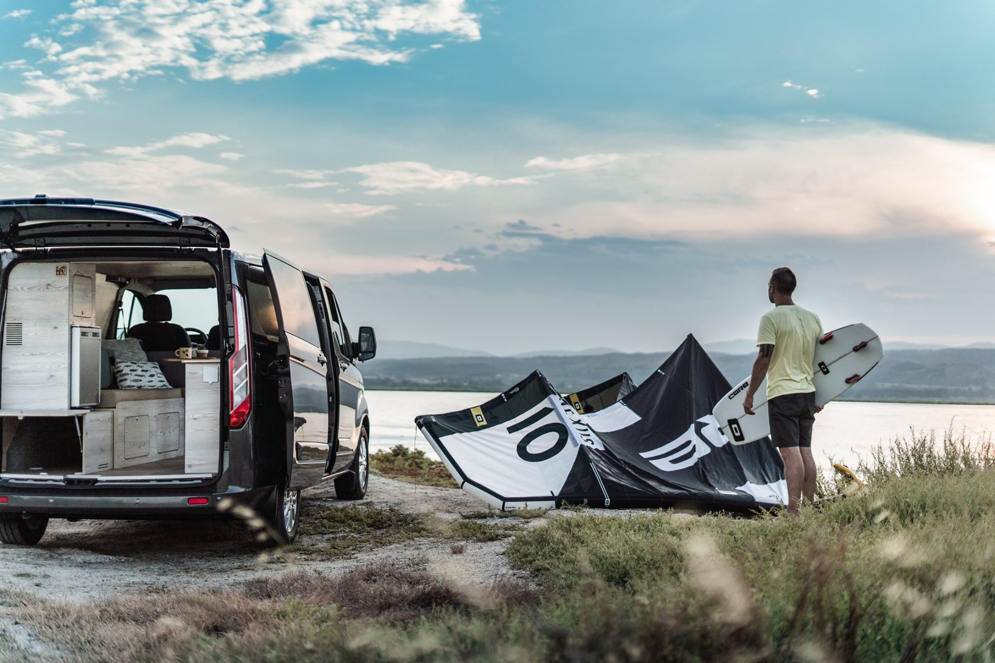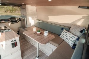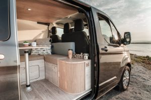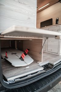 Installé à quelques encablures de Perpignan, Eden Campervan aménage n’importe quel fourgon, quel que soit le gabarit ou la marque. Il est ainsi possible de partir des 4 plans de base pour modifier l’espace et la finition (grâce à 400 références de stratifiés) ou tout simplement de demander un aménagement unique. Réalisé sur le Ford Transit Custom L1H1, le dernier né de l’aménageur dispose d’une implantation modulable et fonctionnelle pour le transport du matériel encombrant (planche à voile, surf) sans mordre sur l’espace de vie. Habillé de bois au ton clair et soutenu pour un parfait contraste, l’aménagement dispose d’une grande banquette convertible en lit dotée de rangements à cloisons amovibles. De quoi créer un grand coffre pour stocker du matériel imposant. Le confort n’est évidemment pas en reste avec un combiné évier/gaz, un frigo, une douchette et de nombreux rangements astucieux.
