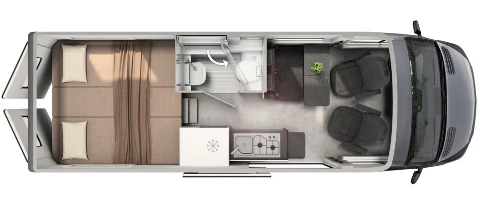 Le CrossTrail revendique une vocation d’explorateur. Deux panneaux solaires de 110 W, le nouveau système Hymer Smart Battery 2.0 avec batteries lithium de 80 Ah et convertisseur promettent jusqu’à dix jours d’autonomie en toute saison. La transmission intégrale, la surélévation, les pneus à crampons et les protections de soubassement confirment ses aptitudes hors asphalte.