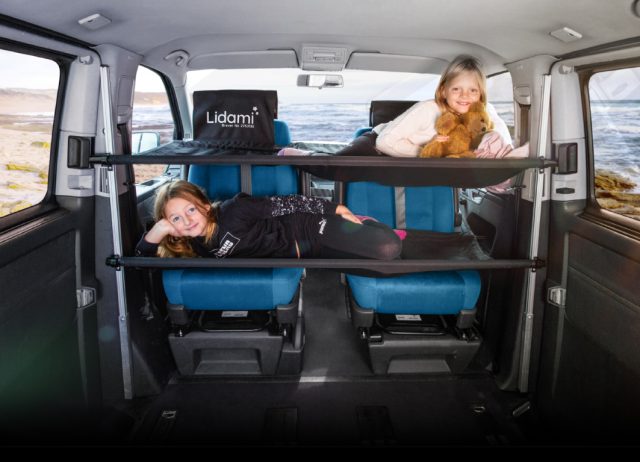 Concept innovant et breveté, le système Lidami permet d’installer des lits superposés pour enfants sur les sièges avant. Il suffit de pivoter les 2 sièges vers le coin salon et d’enfiler Lidami sur les appui-têtes et les dossiers. Des poteaux verticaux soutiennent les barres télescopiques horizontales. L’installation est ultra simple et ne nécessite pas de perçage. Le tissu des hamacs est en Cordura, utilisé par l’armée pour son côté très résistant. Chacune des couchettes peut soutenir 70 kg. La longueur de la couchette varie entre 150 et 160 cm (selon le modèle Lidami compatible avec votre véhicule) pour une largeur de 65 cm. Lidami s’adapte dans pratiquement tous les vans, fourgons et camping-car équipés de sièges pivotants.