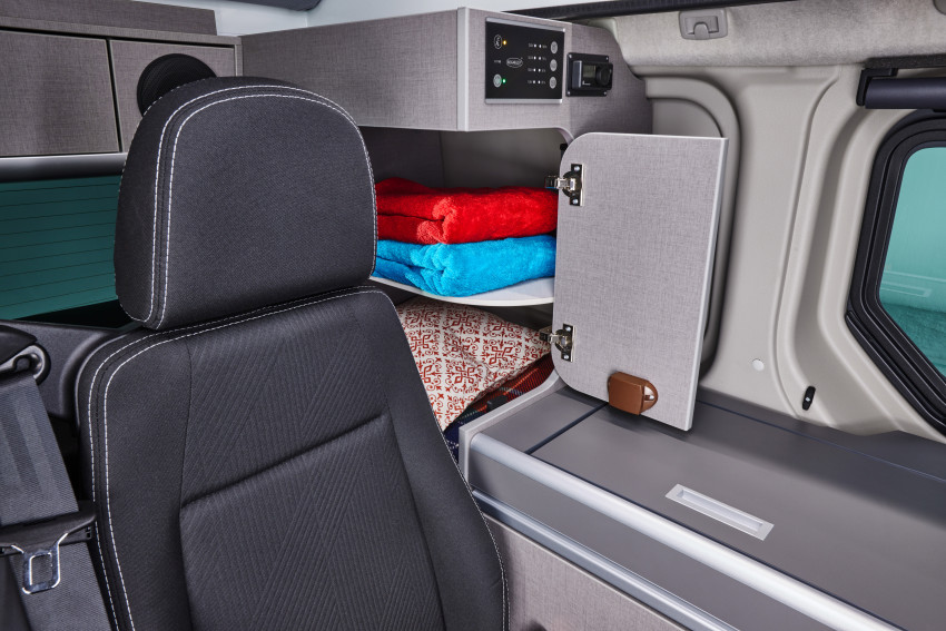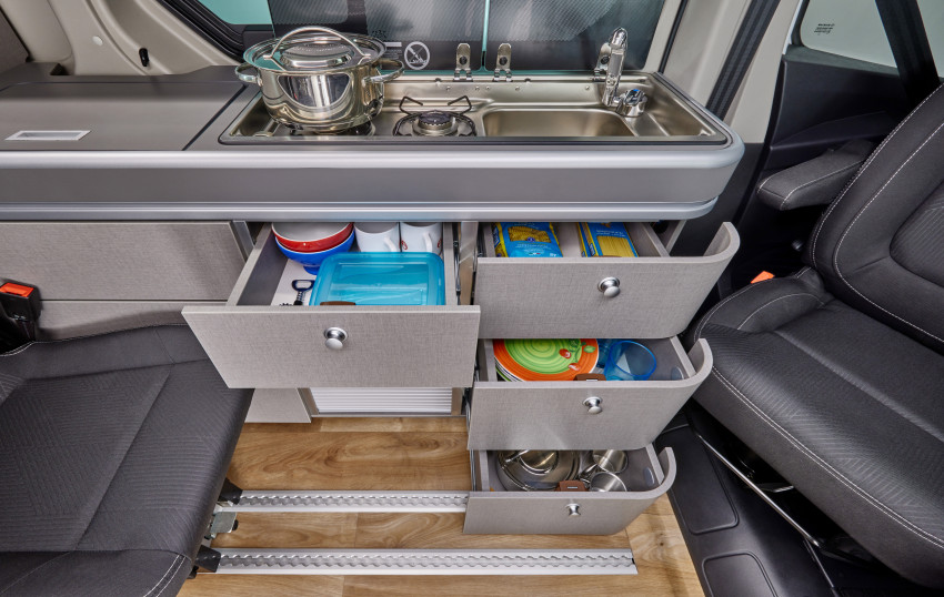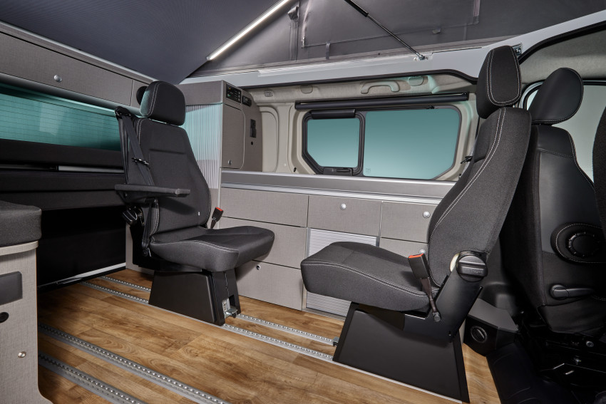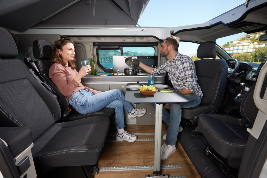 Conscient que le marché du van et fourgon aménagé est en pleine expansion, le constructeur japonais a emboîté le pas à ses concurrents. Conçu en partenariat avec Dethleffs, spécialiste de l’aménagement de véhicules de loisirs, le Nissan Primastar Seaside peut accueillir jusqu’à 6 passagers le jour, en optant pour une rangée de deux sièges en option. Des rails au sol permettent de moduler les sièges comme on le désire. Le coin repas comprend une table amovible, un grand meuble latéral de cuisine, derrière le siège passager, comprenant un évier, une cuisinière 2 feux à gaz, un réfrigérateur de 36 litres, sans oublier de nombreux tiroirs de rangement. A l’arrière, un autre meuble vertical offre un autre espace de stockage. La nuit, 4 personnes peuvent trouver refuge à bord. Ainsi, le couchage dans la partie arrière se déplie sur les sièges rabattus pour offrir un lit double et le toit relevable dispose d’un autre lit pouvant accueillir 2 autres personnes.