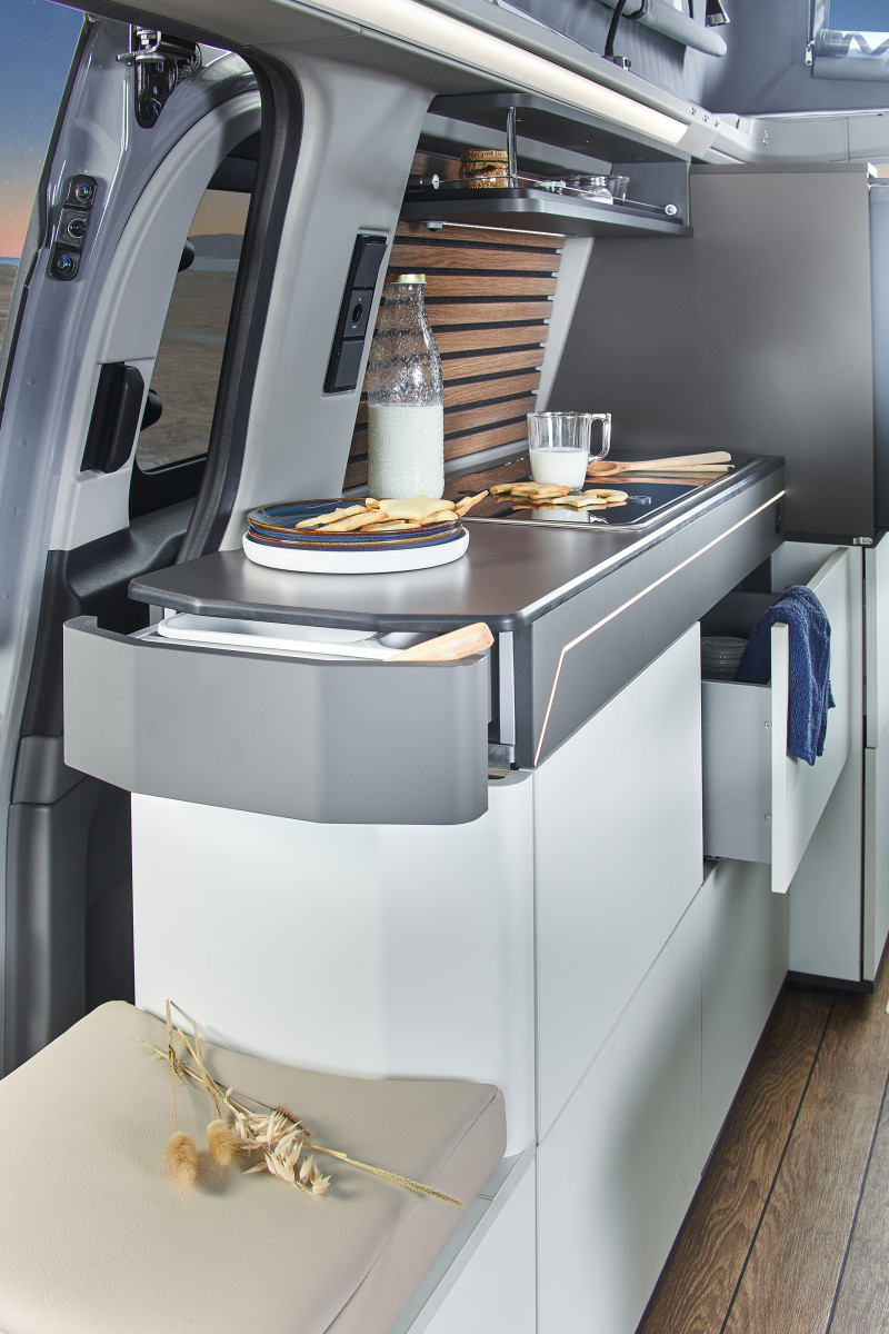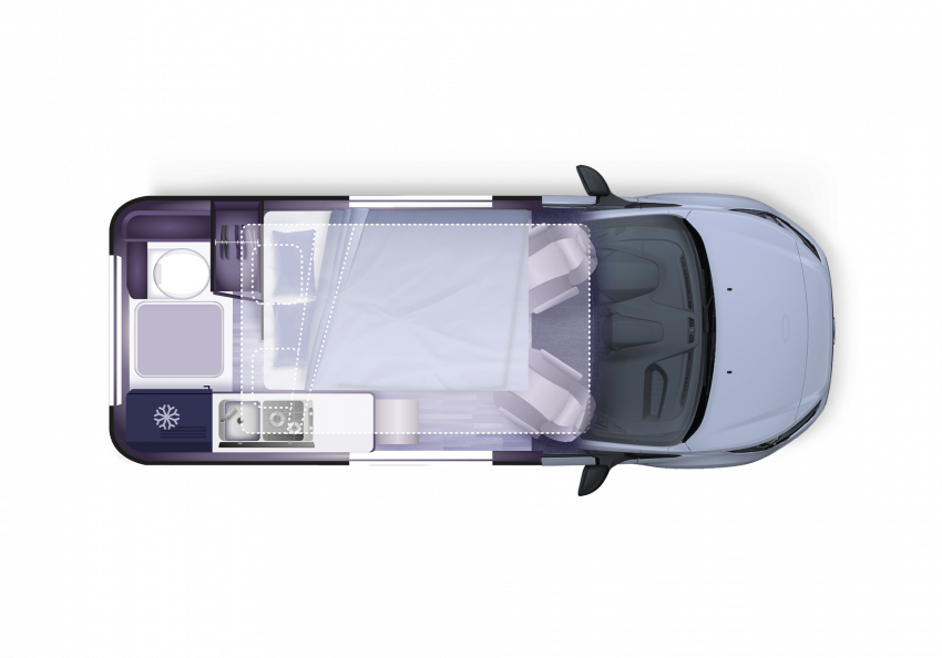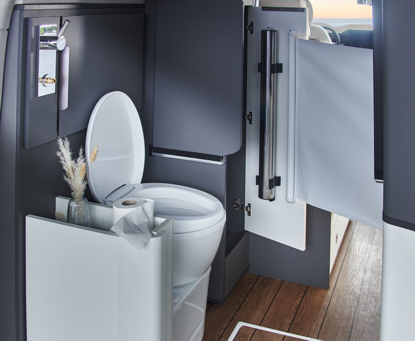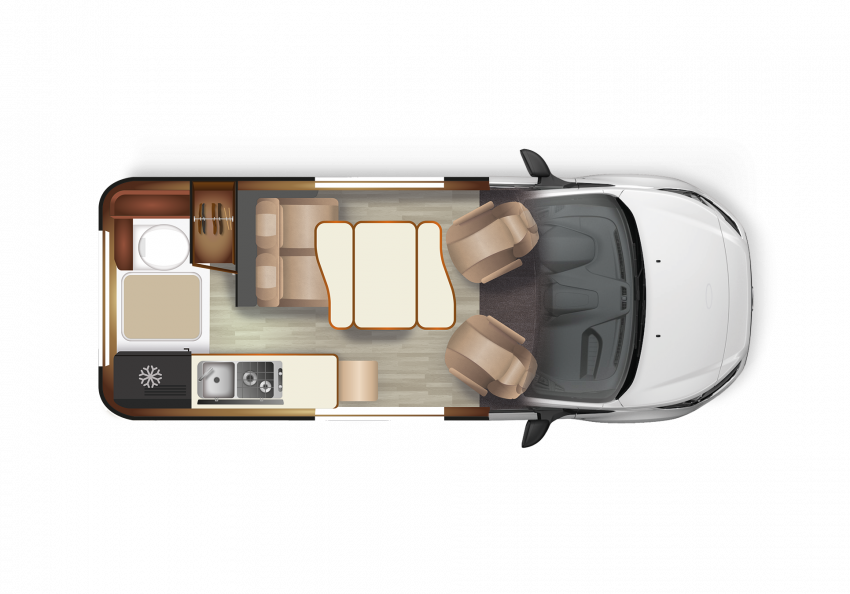 La nouvelle mouture du Ford Transit Custom gagne 11 cm par rapport à la génération précédente qui servait de base au Cap Land jusqu’à présent. Quelques centimètres supplémentaires qui ont conduit les équipes techniques de la marque Mayennaise à revoir en profondeur l’implantation au niveau du salon. Jusqu’à présent, le salon était composé de deux banquettes se faisant face. Une disposition reconnue pour le confort apporté lors des repas, mais qui demandait une grosse gymnastique au moment de transformer ses deux banquettes en couchage. Le nouveau Cap Land est désormais doté d’une seule banquette double face à la route, mais elle se voit équipée d’un système électrique, qui la transforme en couchage en moins de 60 secondes d’une simple pression sur un bouton. Le couchage obtenu ne fait que 90 cm de largeur, mais il suffit de tirer les extensions intégrées et d’y disposer des mousses supplémentaires rangées dans un compartiment dédié pour obtenir une largeur de 124 cm. À signaler que ce système électrique permet également de faire varier l’inclinaison du dossier de la banquette, ce qui offre un supplément de confort une fois à l’étape. Le salon reçoit également une nouvelle table avec deux rallonges latérales, permettant de disposer d’un espace confortable pour 4 personnes. Pour le reste, on retrouve en partie arrière l’espace sanitaire avec son WC fixe et un bac de douche intégré au plancher, ainsi que le réfrigérateur de 51 L et des espaces de rangement.