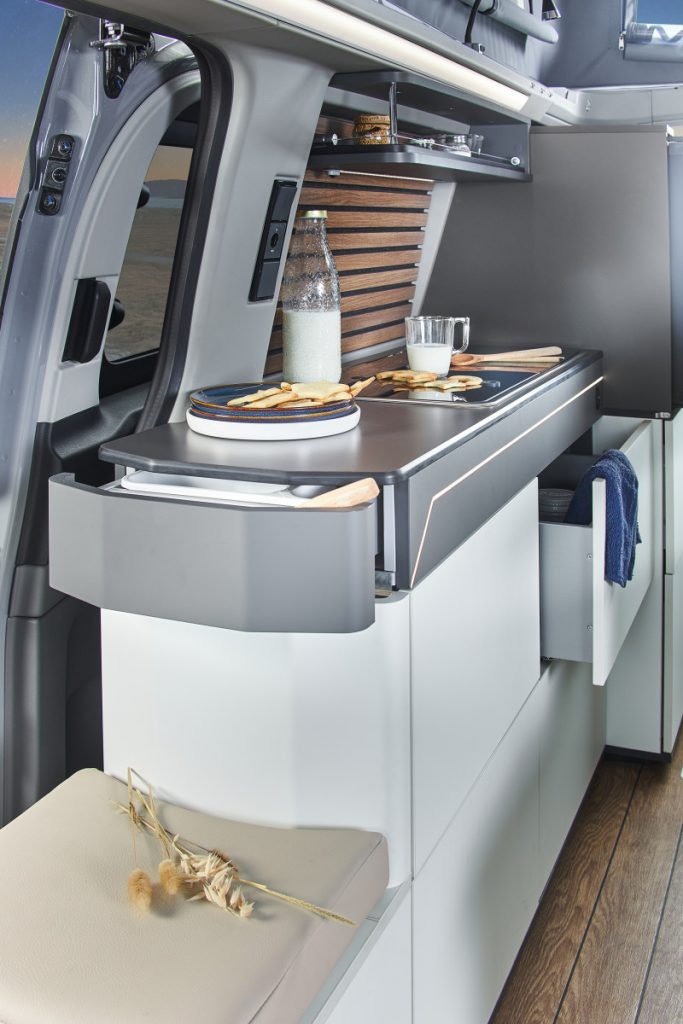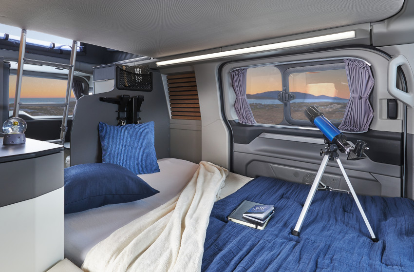 Au-delà de son esthétique qui ne laisse personne indifférent, le nouveau Ford Transit Custom affiche clairement ses ambitions d’offrir une expérience de conduite de haut niveau. Il s’appuiera pour cela sur deux motorisations Diesel de 136 ch et 170 ch, avec pour la plus puissante une association obligatoire avec la boite de vitesses automatique (BVA disponible en option pour la version 136 ch). Il intègre également les dernières aides à la conduite ainsi qu’une planche de bord entièrement digitale qui fait clairement oublier que l’on se trouve dans un van. Pour pleinement profiter de toutes ses capacités, il faudra opter pour le pack « Ready » proposé en option, qui comprend la chauffage Eberspächer 2200W, la douchette extérieure avec eau froide, les jantes de 17 pouces et des vitres arrière et latérales teintées. À signaler parmi les autres options proposées, le chauffe-eau gaz Truma de 10 L.