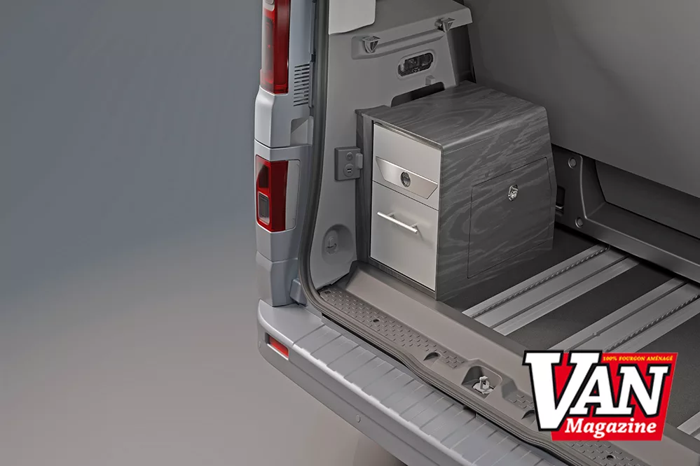 Le module inclut un tiroir pour le réchaud gaz, une extension pour un petit évier semi-souple pliable, son couvercle faisant office de plan de travail, et une douchette alimentée par 5 litres d’eau propre. L’ensemble reste compact mais permet au véhicule d’obtenir l’homologation VASP, un avantage important pour de nombreux utilisateurs.
