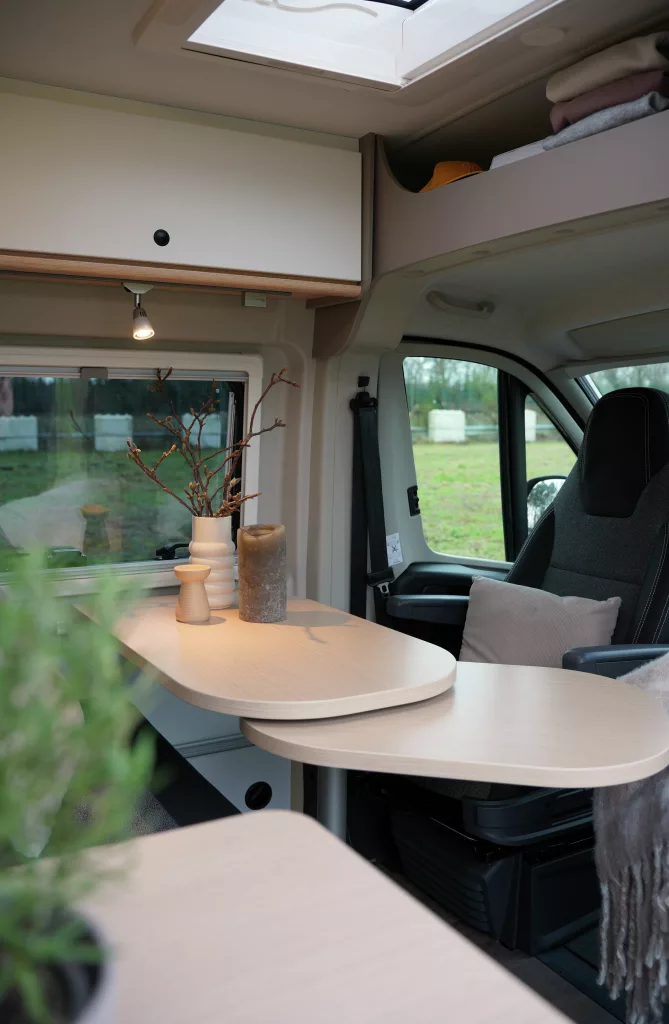 Le Pack Pure renforce clairement le confort à bord : marchepied électrique, caméra de recul, grand lanterneau dans le séjour, véritable équipement douche avec caillebotis bois, dînette transformable ou encore réservoir d’eaux usées isolé et chauffé. Une configuration qui rapproche l’Innovan Pure d’un van plus polyvalent, capable d’affronter un usage quatre saisons. (2 990 Euros)