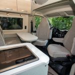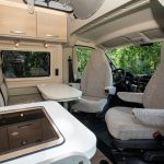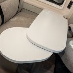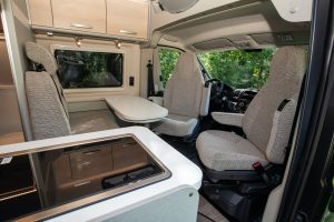 La grande particularité du Free 602, c’est de disposer de 2 lits jumeaux (pour un couchage king size) pour 5.99 mètres. Si cette literie va généralement de pair avec les fourgons de 6.36 mètres, Hymer est arrivé à rester sous les 4 mètres en ajoutant le cabinet de toilette et le bloc-cuisine du Free 540 (5,41 mètres). Malgré tout, le salon reste assez spacieux pour le quotidien. On mange à 4 sans jouer des coudes (une fois la rallonge déployée) et le dessin des sièges fait bonne impression. Pour ce millésime 2020, l’habillage de la cloison côté dinette a été repensé avec un tissu haute qualité qui ajoute également une isolation acoustique supplémentaire. Les rideaux, eux, ont disparu, ils étaient jugés inutiles et ils réduisaient la sensation d’espace.