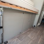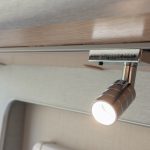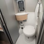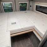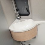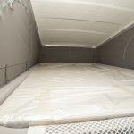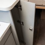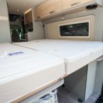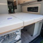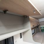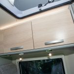 Au-dessus, on trouve de petits placards (disposant toutefois d’une grande profondeur) qui logent des rails « électrifiés » pour disposer les spots Dometic à l’emplacement souhaité. Chacun peut alors moduler l’éclairage. Disponible de série, la combinaison mobilier Grand Oak/tissu Delfi (présente sur notre modèle), assure un côté chaleureux et intemporel, mais en jouant avec le catalogue des options, on peut opter pour le tissu Denver à 295€ (anthracite), Garbo Eco Tech à 760€ (moka), le cuir Grigio ou Napoli (1 805€). En option, cet espace peut se transformer en couchage supplémentaire incluant un coussin supplémentaire, pour 295€. Ce lit permet d’accueillir 2 enfants/ 2 ados mais plutôt un seul adulte avec ses dimensions 1820 x 1010 mm. Dans le toit relevable, l’espace est cette fois plus important avec un matelas tout confort de 2000 x 1350 mm. La trappe, elle, est assez grande pour se hisser par la dinette et les occupants peuvent moduler la clarté de cet espace surélevé en jouant sur les ouvrants à fermeture éclair (un à l’avant, un sur chaque côté).
