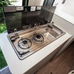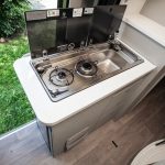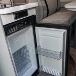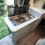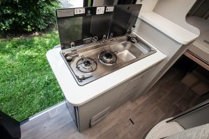Plutôt compact, le meuble de cuisine brille par la qualité de son plan de travail. Les champs sont robustes, les coins sont judicieusement arrondis, ça sent le sérieux. Il intègre un ensemble réchaud 2 feux et évier inox, trois tiroirs. Le réfrigérateur 70 litres (freezer inclus) à compression est intégré sur le côté de l’ilot pour être accessible de l’extérieur. Toujours appréciable lors des repas en plein air…
