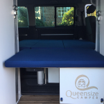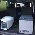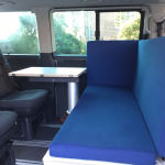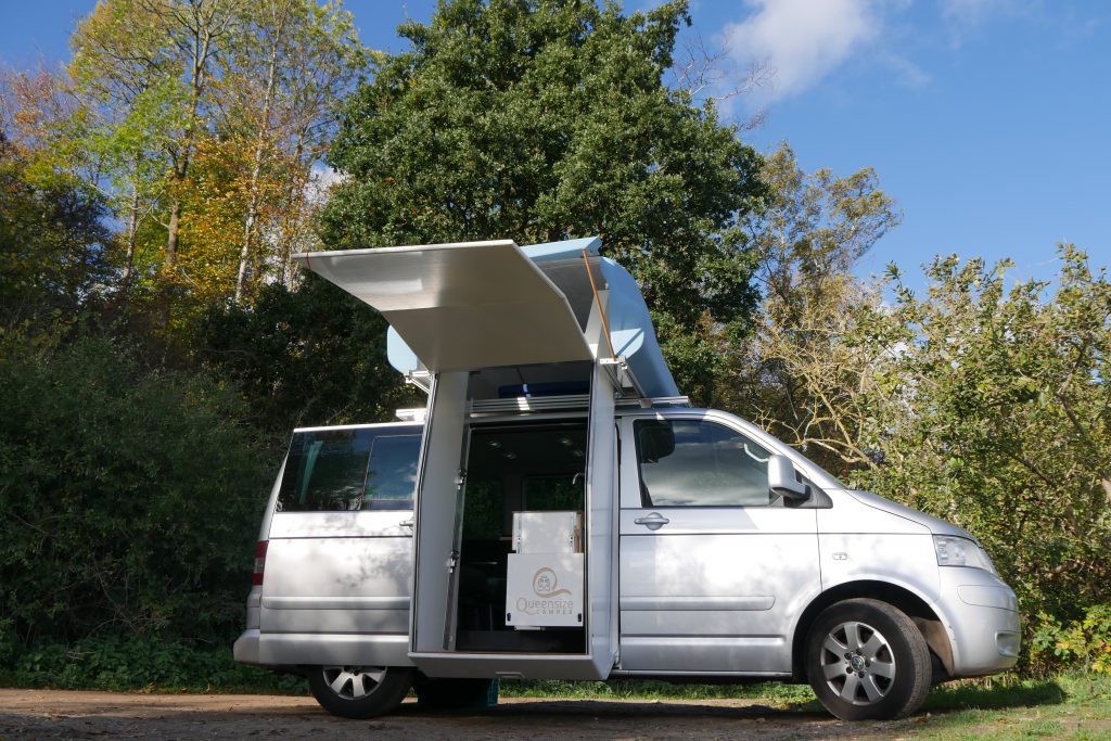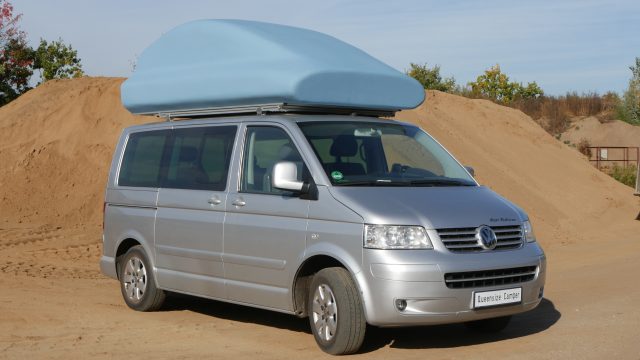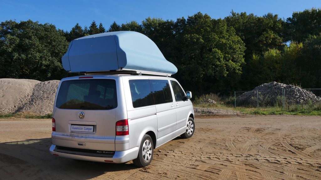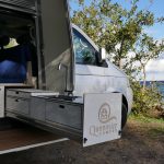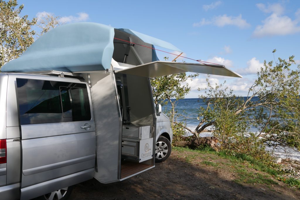 Il s’agit d’une imposante coque en polyester à la forme un peu étrange, qui vient se poser sur la galerie d’un Volkswagen Multivan. Le coffre de toit pivote manuellement à 90 degrés puis se déploie pour offrir plusieurs équipements dont un lit de 200 x 150 cm et une douche fermée. Un système très astucieux qui permet de bénéficier d’un couchage conséquent pour un van. À l’intérieur de la cabine, on retrouve un espace salon qui peut, si besoin, se transformer en espace nuit (200 x 150 cm). Sous les sièges se cache un grand tiroir qui intègre toute la partie cuisine. Installée sur des rails, la cuisine est équipée d’une plaque de cuisson vitrocéramique à deux brûleurs fonctionnant avec des cartouches à gaz, d’un évier ainsi que de quelques rangements pour la vaisselle. Toujours concernant la cuisine, l’évier comme la plaque de cuisson peuvent être surélevés grâce à un ingénieux système de rehausse. À l’arrière, grâce à l’installation du lit sur la largeur, il reste suffisamment de place pour y glisser une toilette à cassette et un réfrigérateur de 80 litres.