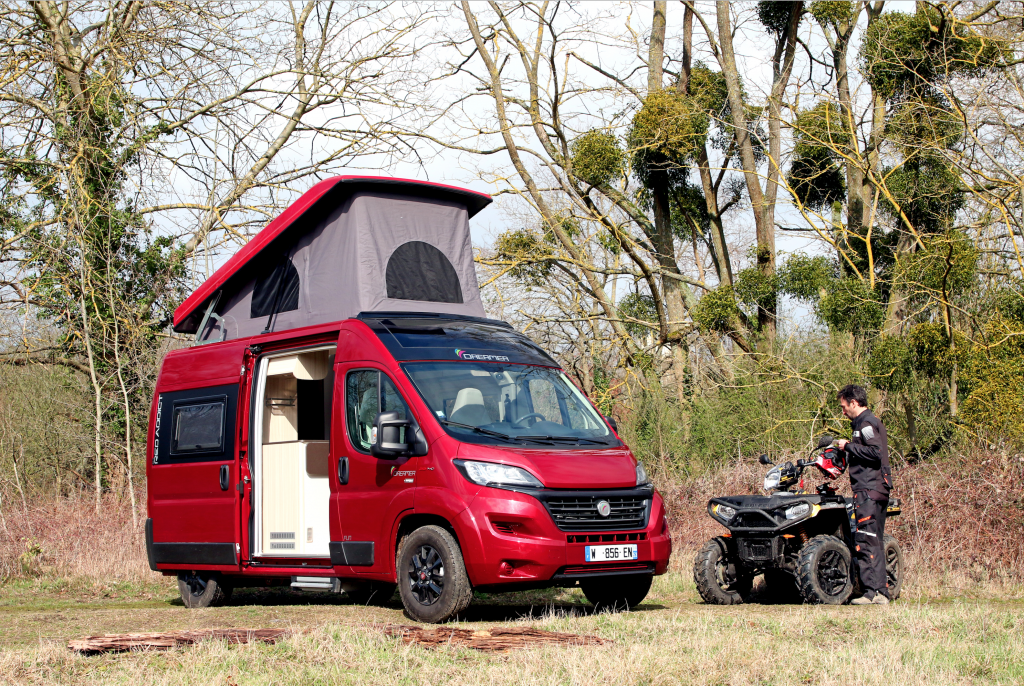 Sur base de Fiat Ducato, ce fourgon aménagé à la particularité d’être équipé d’un toit relevable. D’une taille de 5,41 m, il dispose également de 4 couchages et de 4 places carte grise. Dans l’habitacle, on retrouve tout le nécessaire pour voyager sereinement avec notamment un bloc-cuisine, un réfrigérateur, une salle d’eau, des w.c. ou encore des rangements. Le Dreamer D43 Up Red Addict est disponible à partir de 52 900 euros.