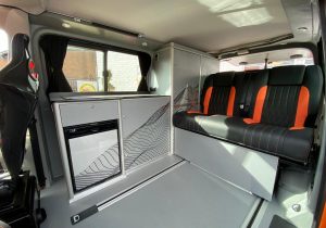 À bord, l’implantation est connue de l’aménageur (Columbus), mais a été revue pour les conditions extrêmes avec un plancher plus résistant aux frottements et aux salissures. Le plan reprend le principe du California avec la cuisine en face de la porte (équipée d’un réchaud à 2 feux et d’un évier, d’un réfrigérateur de 50 litres) et un meuble de stockage en partie latérale arrière. La banquette se positionne à l’horizontale pour offrir un couchage et deux personnes supplémentaires peuvent dormir à l’étage, dans le toit relevable SCA à toile souple. Notons aussi les baquets à coque en carbone qui maintiennent les passagers pendant les fortes sollicitations en tout-terrain. Non distribué en France (pour l’instant ?), ce fourgon est affiché à un peu moins de 64 000€ en France (modèle à 2 couchages).