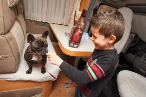Ne prenez pas la route sans avoir familiarisé votre animal avec le fourgon. Nos amis à 4 pattes sont stressés (parfois plus que les humains) et sont très sensibles au changement d’environnement. Si vous l’installez dans un véhicule (alors qu’il a pris l’habitude de rester à la maison) et que vous traversez la France, il sera fortement incommodé. Cela peut se traduire par de petites attaques de paniques, des bêtises, des nausées et plus généralement un comportement inhabituel. Rassurez-vous, cela ne veut pas dire que votre animal est incapable de voyager. Il faut simplement l’habituer pour le rassurer. Plus il sera jeune, plus vous aurez de chances d’en faire un parfait globe-trotteur. Quelques mois avant de partir, faites-lui visiter le fourgon régulièrement. Il fera connaissance avec cet environnement en reniflant chaque m2, voire en marquant son territoire. Si cette réaction est fortement déplaisante, elle indique toutefois que l’animal s’est approprié les lieux. N’hésitez pas à l’emmener sur de courts trajets à bord du fourgon aussi souvent que possible. Cela permettra de le familiariser avec la conduite. Enfin, faites-le dormir de temps en temps dans le véhicule avant le grand départ. C’est de loin la meilleure solution pour qu’il se familiarise avec sa prochaine habitation de vacances. Si en amont le travail a bien été fait, quand vous partirez il montera de lui même et s’installera à la place qu’il avait trouvée quelques semaines en arrière. Tout au long du séjour, conservez les mêmes habitudes qu’à la maison. Le mieux est de le laisser dormir dans son panier habituel et d’emmener ses jouets. Cela constitue pour lui de vrais points de repère avec cet environnement qui reste familier. De la sorte, il ne sera pas stressé et passera lui aussi de bonnes vacances !