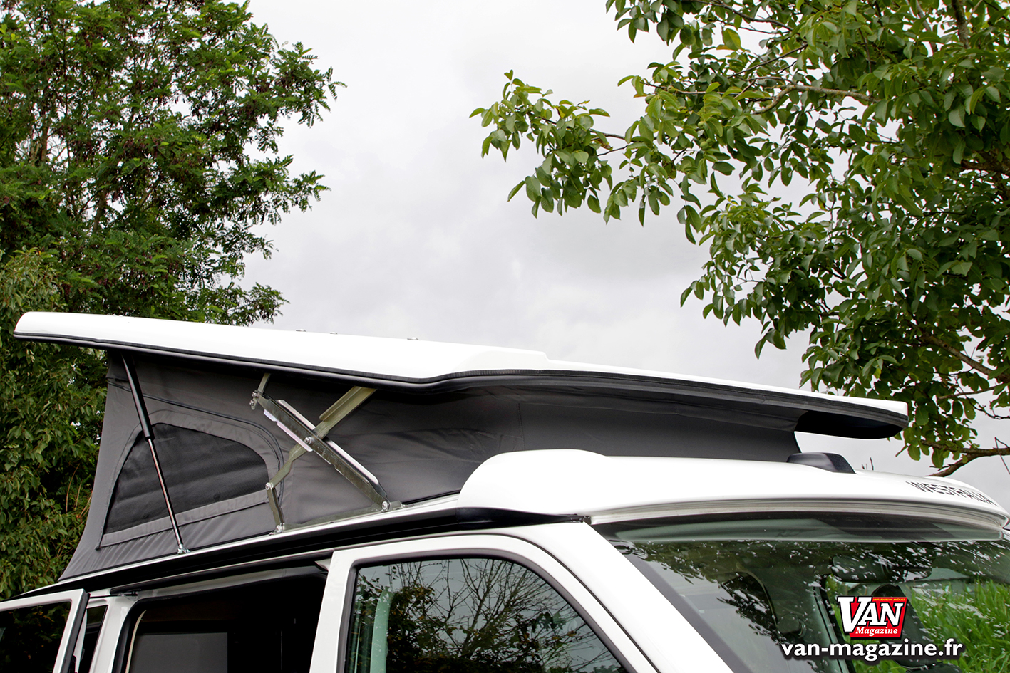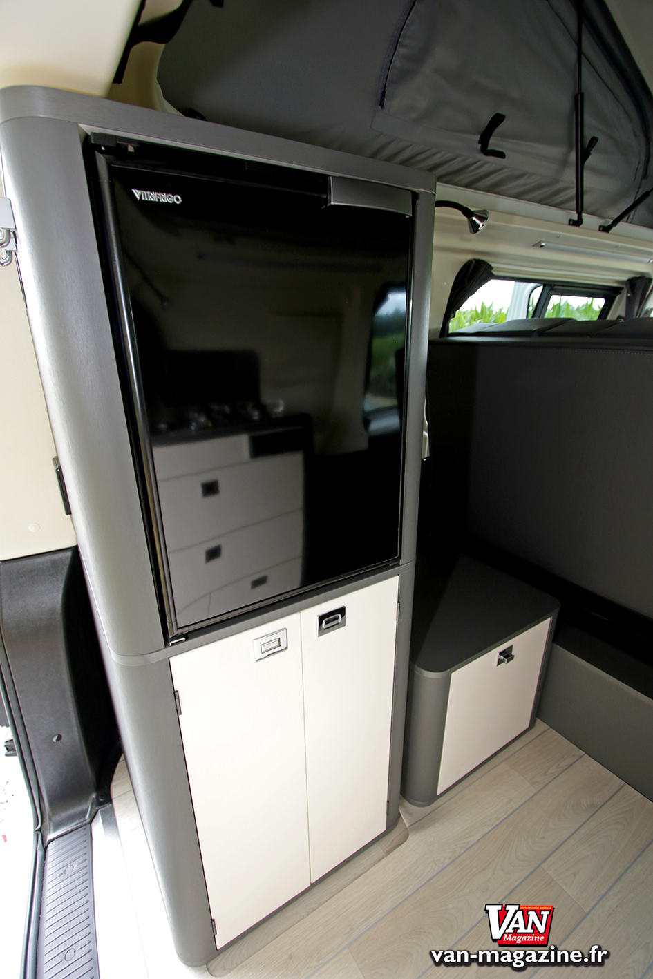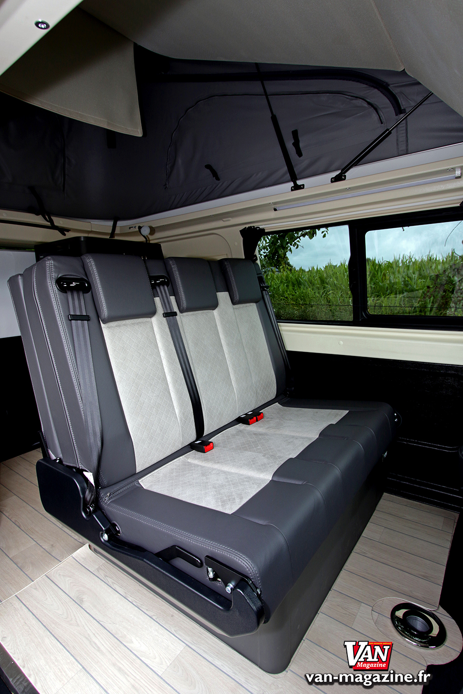 Après le Kepler One (modèle complet avec espace sanitaire) et le Kepler Six (modèle évolutif pouvant accueillir jusqu’à 6 passagers), Westfalia étoffe son offre avec le Kepler Five, qui en toute logique, offre 5 places carte grise. C’est toujours le Volkswagen Transporter 6.1 qui sert de base à ce modèle, dans sa longueur 4,90m pour une hauteur de 1,99m, toit relevable compris. L’implantation proposée fait l’impasse sur les sanitaires, pour offrir un maximum d’espace intérieur. C’est pour cette raison que le toit relevable s’ouvre sur la partie arrière, qui reçoit d’un côté un bloc cuisine complet et de l’autre, un meuble pleine hauteur intégrant un réfrigérateur à compression de 51 litres et des rangements. Soulignons pour ces deux meubles, le soin apporté à la finition et au design. C’est donc par cette partie arrière que l’on accède au lit du toit relevable, qui propose un couchage de 120 x 190 cm. Zone de couchage dont il est possible de renforcer l’isolation par une toile spécifique (570 €), permettant son utilisation sur une plus grande période de l’année. En l’absence de sanitaire (ndlr : il est possible en option d’acquérir un WC portable Porta Potti intégré dans un coffre, qui prend place entre le réfrigérateur et la banquette, au tarif de 490 €) et avec l’espace cuisine déporté sur l’arrière, la partie centrale du fourgon est exclusivement dévolue à l’espace salon. Espace qui comprend la banquette 3 places, qui fait la spécificité de ce Kepler Five. Avec la table amovible et les deux sièges pivotants, ce sont donc bien 5 personnes qui pourront prendre place au salon lors d’un repas.