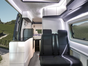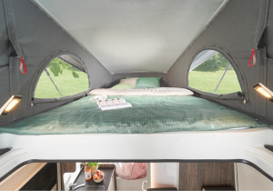 L’espace supérieur se met en place en moins de 60 secondes et donne lieu à un couchage 2×1,35m pour un couple. Ceux qui veulent maitriser leur autonomie pourront également opter pour un panneau solaire photovoltaïque incroyablement fin (moins de 5 millimètres d’épaisseur), léger et résistant à la grêle. Notons aussi la possibilité d’adopter le skyview (pour ajouter une sensation d’espace et maximiser la luminosité) qui peut s’occulter la nuit grâce à un store dédié.